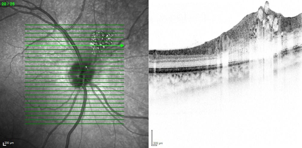 Los hamartomas combinados de retina y epitelio pigmentario retiniano (CHRRPE) son raros tumores benignos, caracterizados por la proliferación del epitelio pigmentario retiniano (EPR) y tejido glial, generando gran distorsión papilar y retiniana. Se aprecia una lesión solitaria unilateral sobrelevada, hiperpigmentada, acompañada de tortuosidad vascular y membrana epirretiniana (MER).